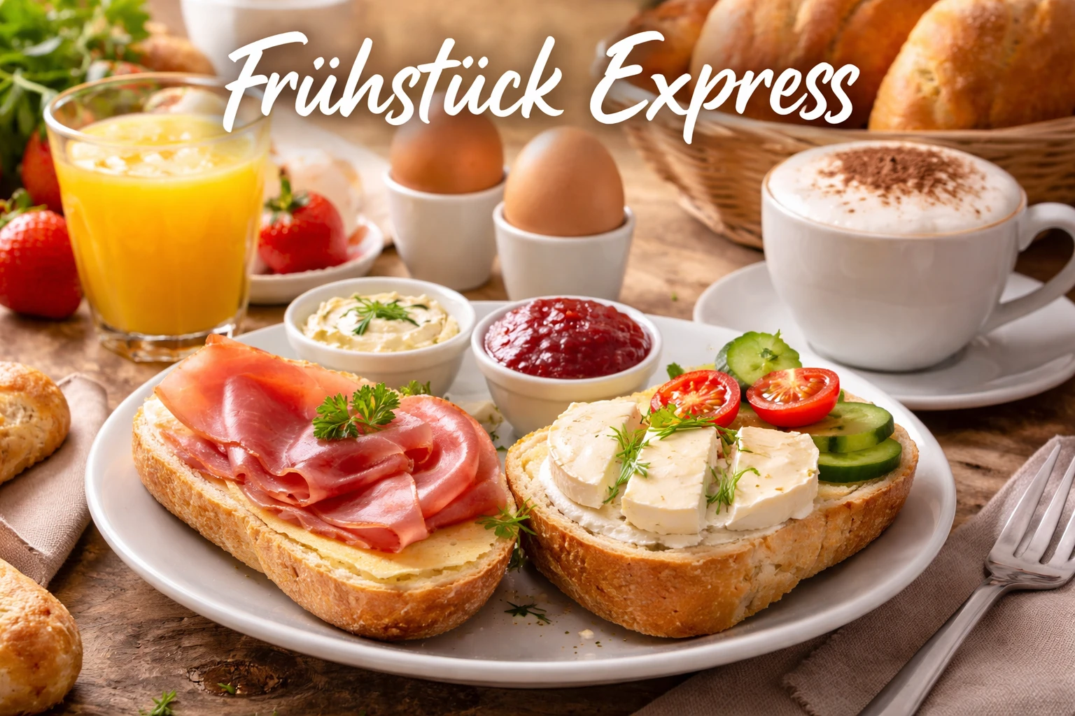 Das Frühstück Express ist ein klassisches Frühstücksangebot, das speziell für Gäste entwickelt wurde, die ein schnelles, aber dennoch hochwertiges Frühstück suchen. Es besteht in der Regel aus zwei halben belegten Brötchen, die individuell nach Geschmack ausgewählt werden können.